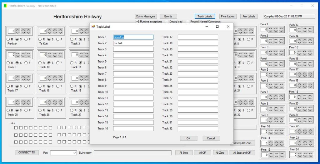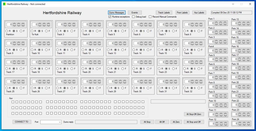 HertfordCode is based on LincolnCode and is currently under development. The GUI has been drafted as shown. The Hertfordshire Railway system is based on 32 track segments. This is a draft partially tested release and it includes running the interpreter, with tests of each hardware channel; there has been no sensor testing or testing of the ability to make decisions based on sensor readings. Download HertfordCode (2026/02/03b), the MIT license applies. You can support the development of code by Microtron NZ at this GiveSendGo website.