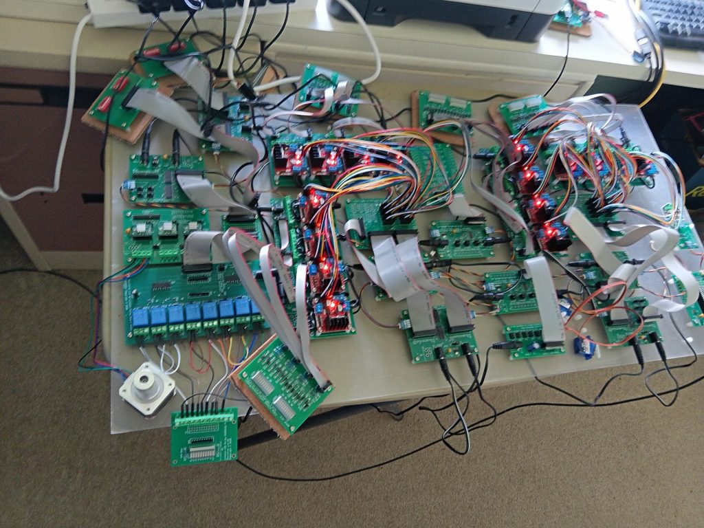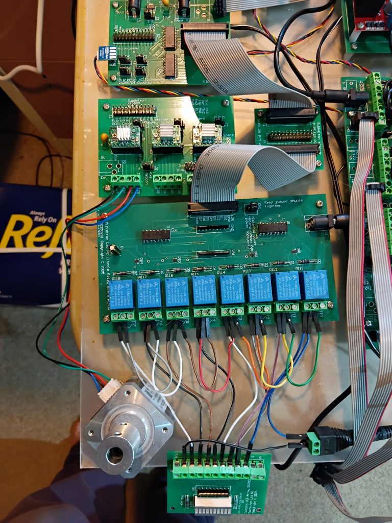 The IOExpander board at the top of the image can drive 4 banks of eight relays, but one bank is currently shown, along with some diagnostic testing connections. Alternatively the I2C-IOExpander can drive 3 stepper motors, along with two banks of 8 relays. The stepper motors worked with old-fashioned addressable latches, but the I2C-IOExpander shown, is currently too noisy; a remedial measure is currently under development and newly designed parts are awaited for testing. There is also an older design for the I2C-IOExpander available, where there are 4 direct I2C-IOExpander connections to the relay boards. An updated relay PCB is planned, where there will be isolation slots between the relays, that would be preferable for switching mains voltages. If needed the spacing between the relays can also be increased. The digital signal on the PCB is optically isolated from the 12V supply and that is isolated by the relays from power circuitry. Not shown is the MCU that provides the I2C signal that controls the relays. The I2C connector sockets are PiicoDev, which is a commonly used socket for this purpose. 3.3V logic (RPi PIco) is currently used, but the boards are also designed for use with 5V logic, such as most Arduinos.